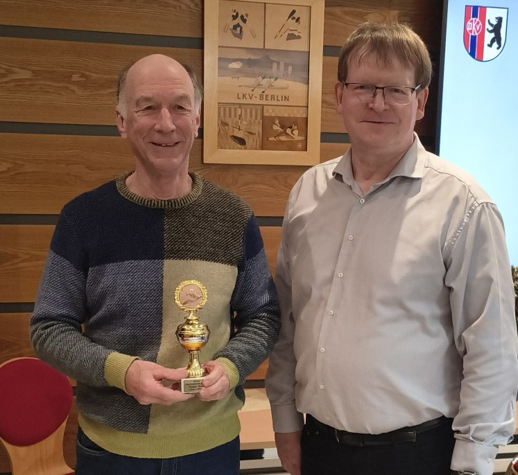 Unser Kurmärker Reiner Wiese hat sein vor viereinhalb Jahrzehnten erworbenes Wandersportabzeichen Gold 45 Jahre lang jährlich verteidigt und wurde dafür gestern beim Berliner Landeskanuverband vom Landeswanderwart Holger Matz mit Urkunde und Anstecknadel »Gold Sonderstufe 45« geehrt. Außerdem hat Reiner in 2025 die drittmeisten Kilometer (4508 km) in Berlin gepaddelt und erhielt dafür (wieder einmal!) einen Pokal. Herzlichen Glückwunsch, Reiner !